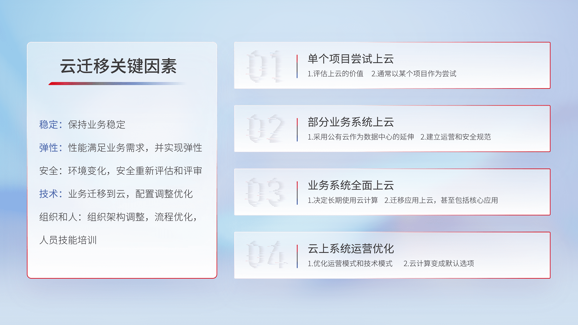 结合实际业务,,从规划设计、、云平台选型、、云原生改造、、、数据迁移、、集成交付,,,迁移全过程为客户识别最佳上云路径,,,,做好风险识别管理,,设计网络架构、、、身份权限、、安全审计合规、、、操作审计、、日志审计、、、、监控告警策略、、、多站点容灾设计等,,,对云上基础设施进行整体规划,,,,提升IT治理水平,,,,以满足弹性、、、高可用、、、高性能的需求。。。