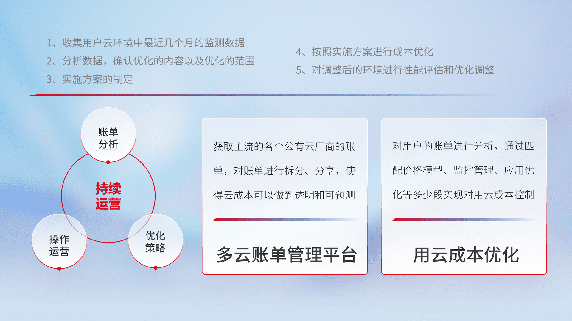 通过多云纳管,,以统一的资源数据模型把客户的云资源进行抽象和封装,,进而实现对多云资源的统一操作,,,,保障云资源管理的可靠性、、、、稳定性与可用性。。。量身定制化运维内容,,,,配置、、开发运维、、、、补丁管理、、、、备份、、、、监控、、、、认证和访问管理、、审计和日常巡检等,,,保障在用云过程中的可靠度,,,,稳定度以及高可用率。。