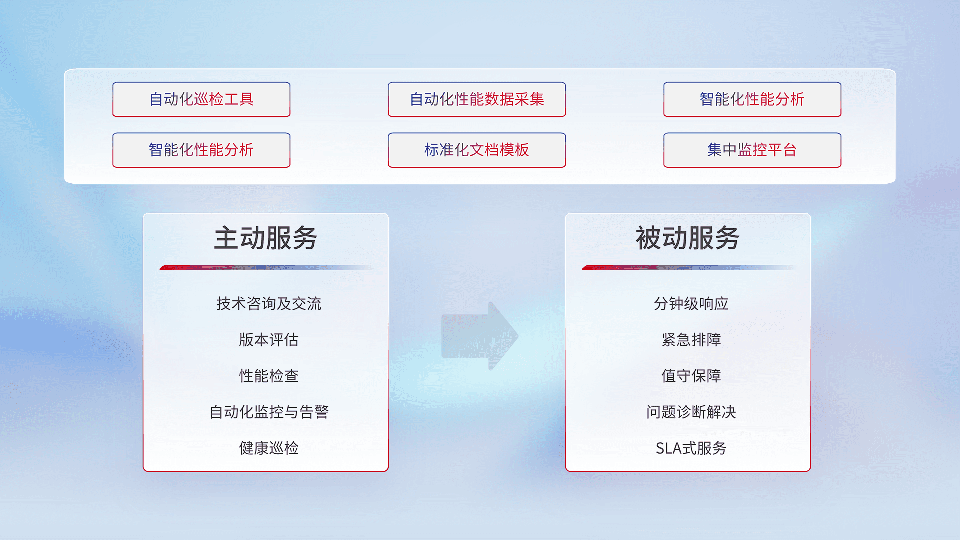 智能化工具和标准化文档,,,保障服务质量,,,,提供主动服务(包含技术咨询、、、版本评估、、、、性能检查、、、、自动化监控与告警、、健康巡检)和被动服务包含(分钟级响应、、、、紧急排障、、值守保障、、问题诊断解决、、、、SLA服务)。。